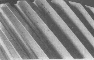 大齒輪齒面的初期點蝕。點蝕密度最大區與表面載荷最高區相一緻 。
