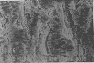油膜相對於重載很薄的潤滑條件下運轉的齒輪副工作齒面的損傷。損傷面放大後可見密密麻麻成片的微小蝕微小裂紋 。