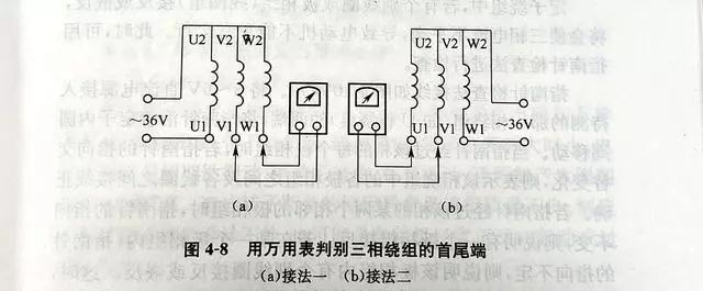 将三相繞組接成星形,從一相繞組接入36V交流電源,在另外兩相繞組的一端接入置於(yú)10V交流電壓擋的萬用表,按圖4-8(a)和(b)所示各接一次。 通電後,觀察萬用表指針的擺動情況。若兩次萬用表指針均不動,則說明圖中所示的首尾端正確(què);若兩次萬用表指針都偏轉,則說明兩次均未接電源的那一相的首尾接反 ;若隻有一次指針偏轉,另一次指針不動,則說明指針不動的那一次中接電源的那一相首尾接反 。