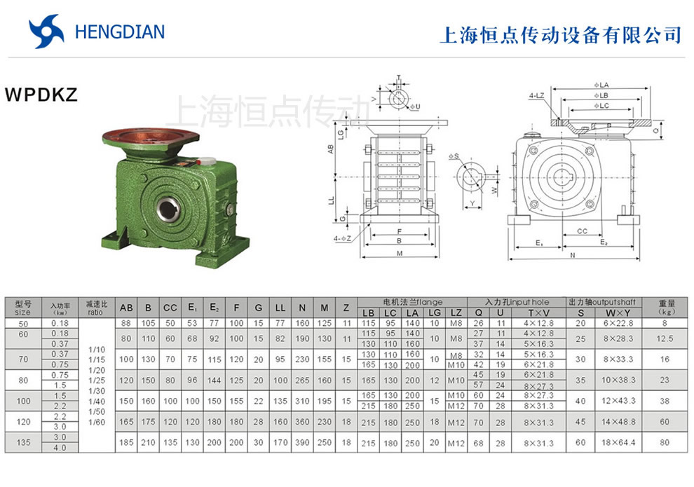 軸指向表示方法.WPDKZ減速機法蘭輸入,軸輸出.機座号從50到135,可選速比從10到60.WPDKZ系列蝸輪蝸杆減速機選型指南,WPDKZ蝸輪蝸杆減速機的外形尺寸及安裝尺寸